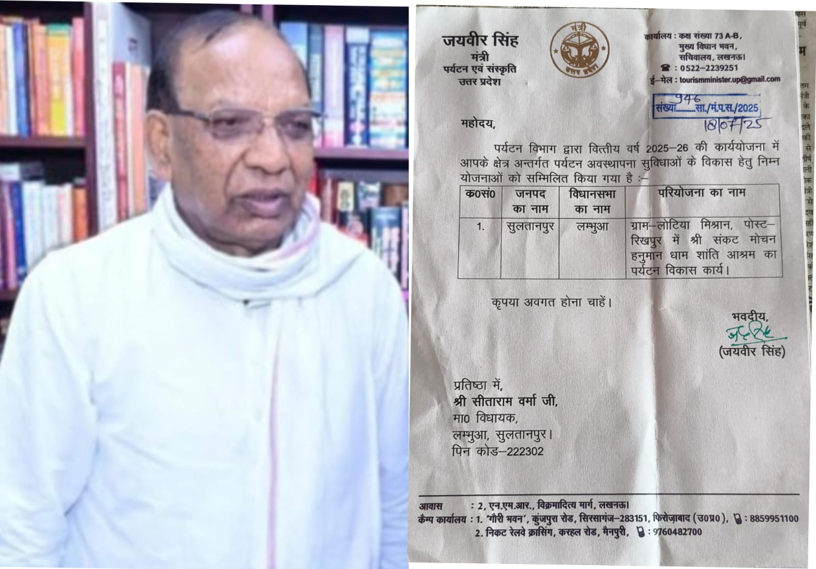 लम्भुआ विधायक सीताराम वर्मा द्वारा संकट मोचन हनुमान धाम शांति आश्रम विकास कार्य के लिखा गया पत्र मिली संस्तुति