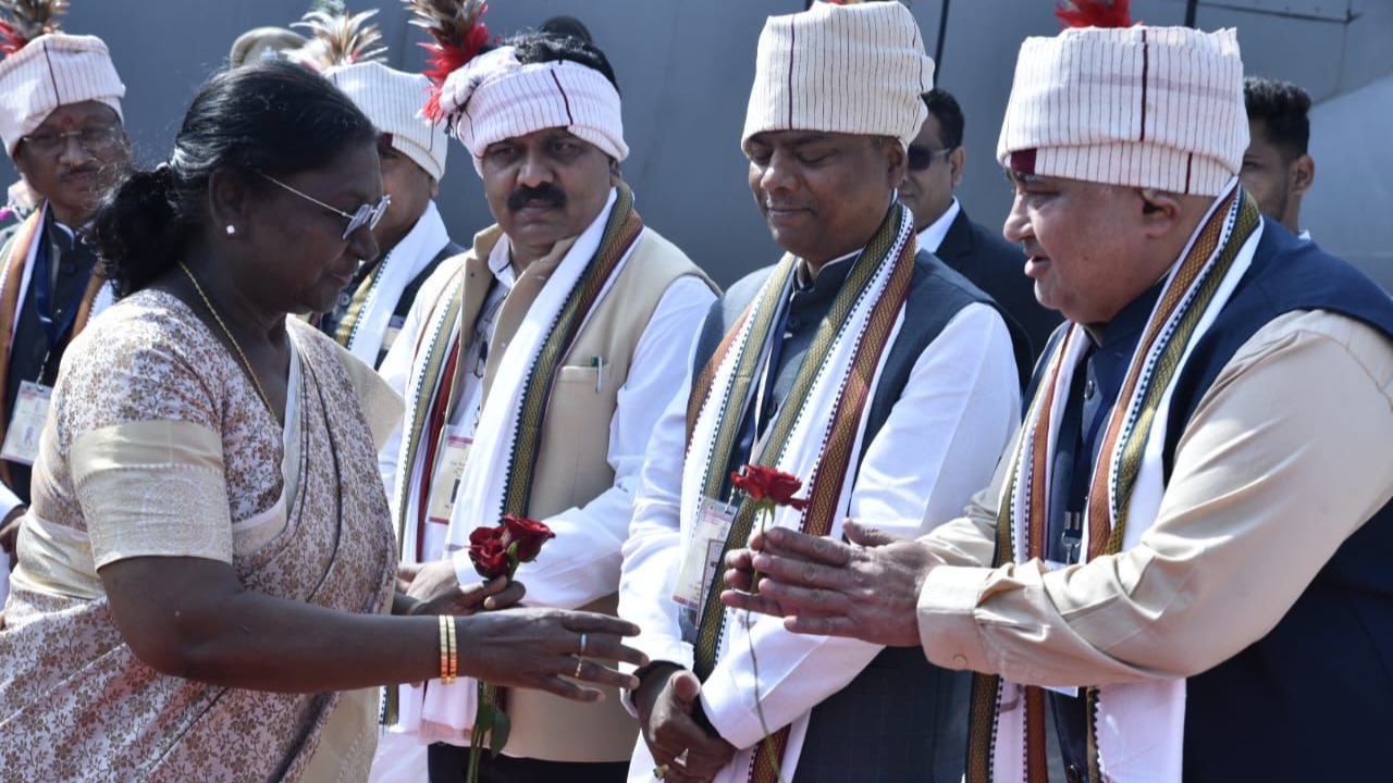 एयरपोर्ट पर उप मुख्यमंत्री विजय शर्मा, केंद्रीय राज्य मंत्री तोखन साहू और वन मंत्री केदार कश्यप ने राष्ट्रपति का अभिनंदन किया। सांसद महेश कश्यप, जगदलपुर विधायक किरण सिंह देव और महापौर संजय पांडे ने भी राष्ट्रपति का अभिवादन करते हुए स्वागत किया। इस दौरान कमिश्नर डोमन सिंह, पुलिस महानिरीक्षक सुन्दरराज पी, कलेक्टर आकाश छिकारा और पुलिस अधीक्षक शलभ सिन्हा सहित अन्य जनप्रतिनिधियों ने भी राष्ट्रपति का आत्मीय स्वागत किया।